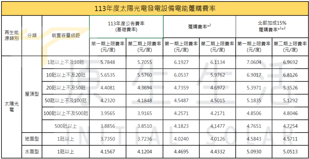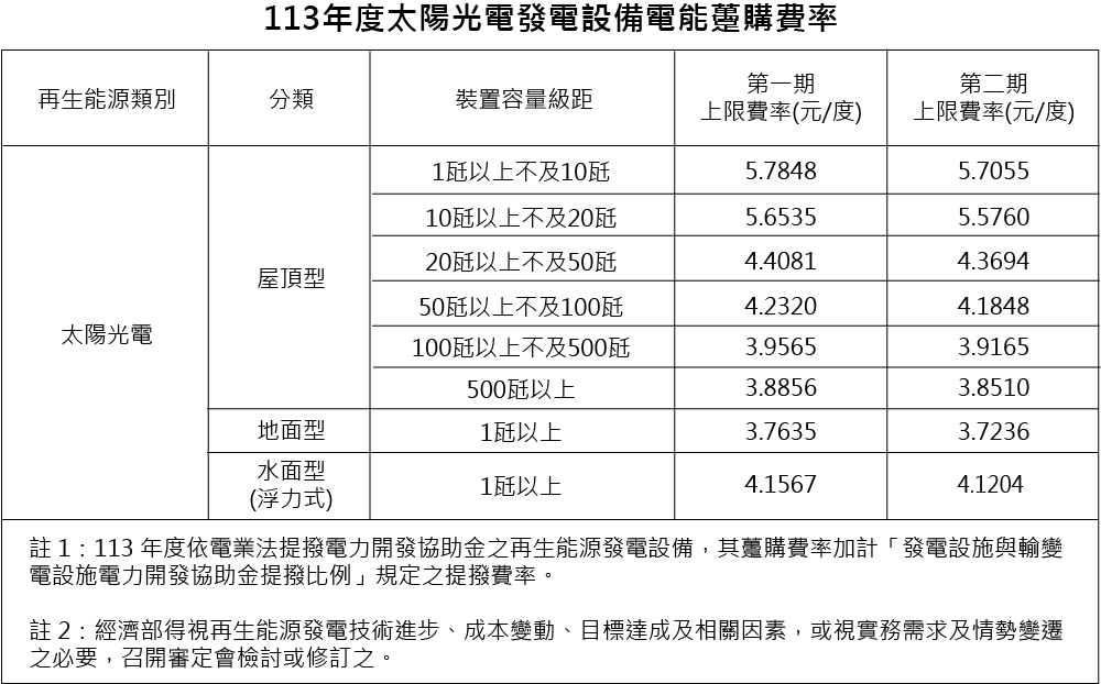 綠能知識 首頁 最新消息 綠能知識 最新消息 優惠訊息 綠能知識 案例實績 太陽能光電 —工廠 —住家 —學校 —其他 太陽能自發自用 熱泵熱水系統 最新消息 優惠訊息 綠能知識 案例實績 太陽能光電 —工廠 —住家 —學校 —其他 太陽能自發自用 熱泵熱水系統 經濟部完成「中華民國113年度再生能源電能躉購費率及其計算公式」之審定作業,與112年度相比,除太陽光電微幅下修外,其餘再生能源則持平或微幅上漲;另為鼓勵公民電廠、集合式住宅等微型、中小型家戶屋頂設置太陽光電設備,針對不及100瓩之屋頂型太陽光電,再細拆為4個級距。太陽光電:採一年二期,並按各分類容量級距區分,第一期躉購費率介於每度3.7635~5.7848元,第二期躉購費率則介於每度3.7236~5.7055元。